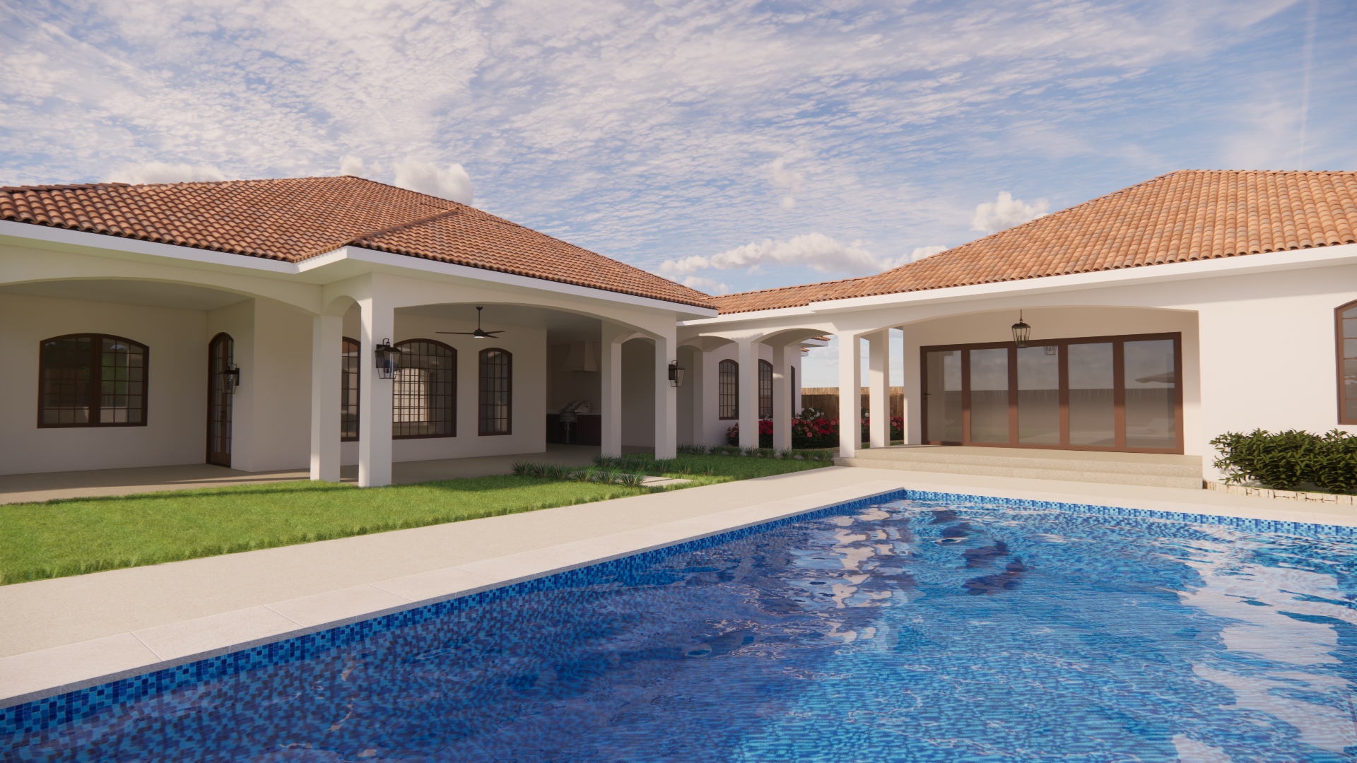 This Mediterranean-style villa provides vacation vibes and a relaxed atmosphere for everyday living. The open concept floor plan and thoughtfully designed kitchen make entertaining easy. Bedrooms tucked into each wing provide privacy and quiet for working, studying, or sleeping. The primary suite has a spa-like bathroom, offering homeowners the ultimate retreat. Outdoors, enjoy the covered patio with an outdoor kitchen and dining space, swim in the pool, or bask in the sun. The pool house provides extra space that can serve as an office, exercise room or workshop. It can also be configured as a mother-in-law suite.